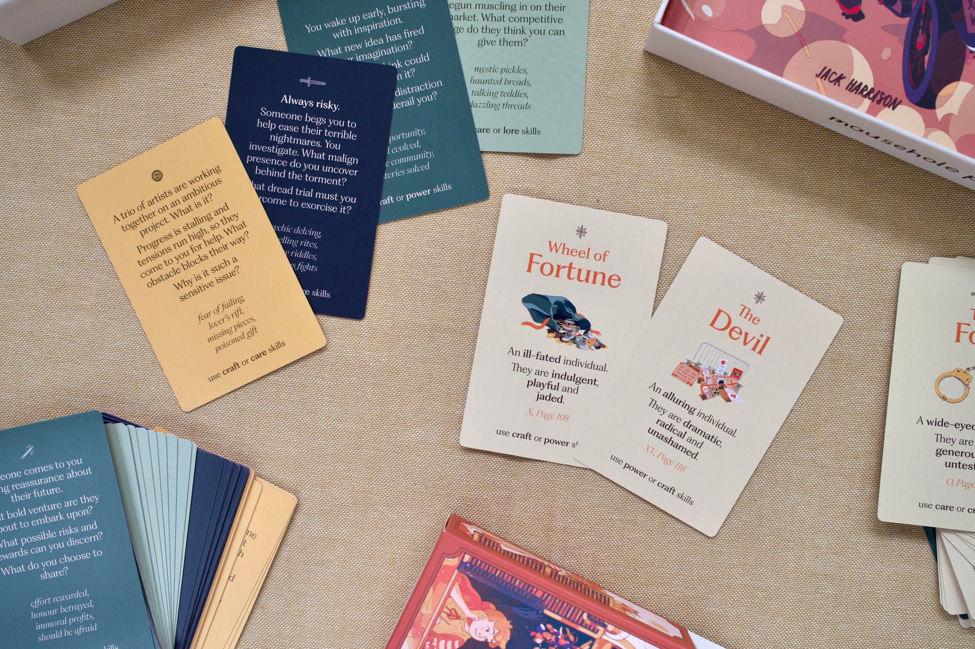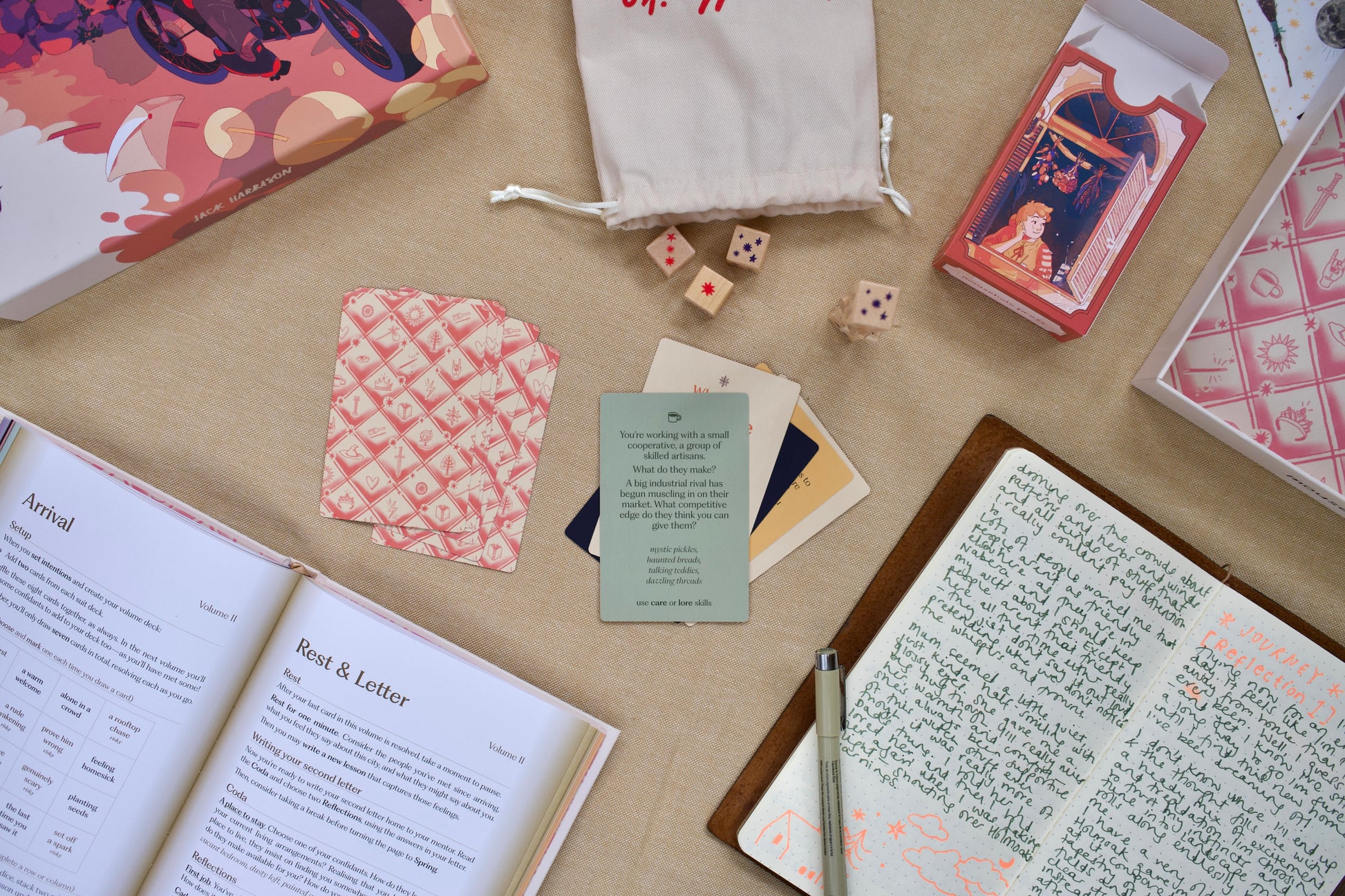 Then, with your version of Koriko established, your witch can explore and meet its weird and wonderful residents. To do this you’ll draw cards, each relating to a prompt that introduces a new event to your story. These prompts are a chance to exercise your creative writing muscles—and when things get risky, we'll add dice to an increasingly-precarious stack!